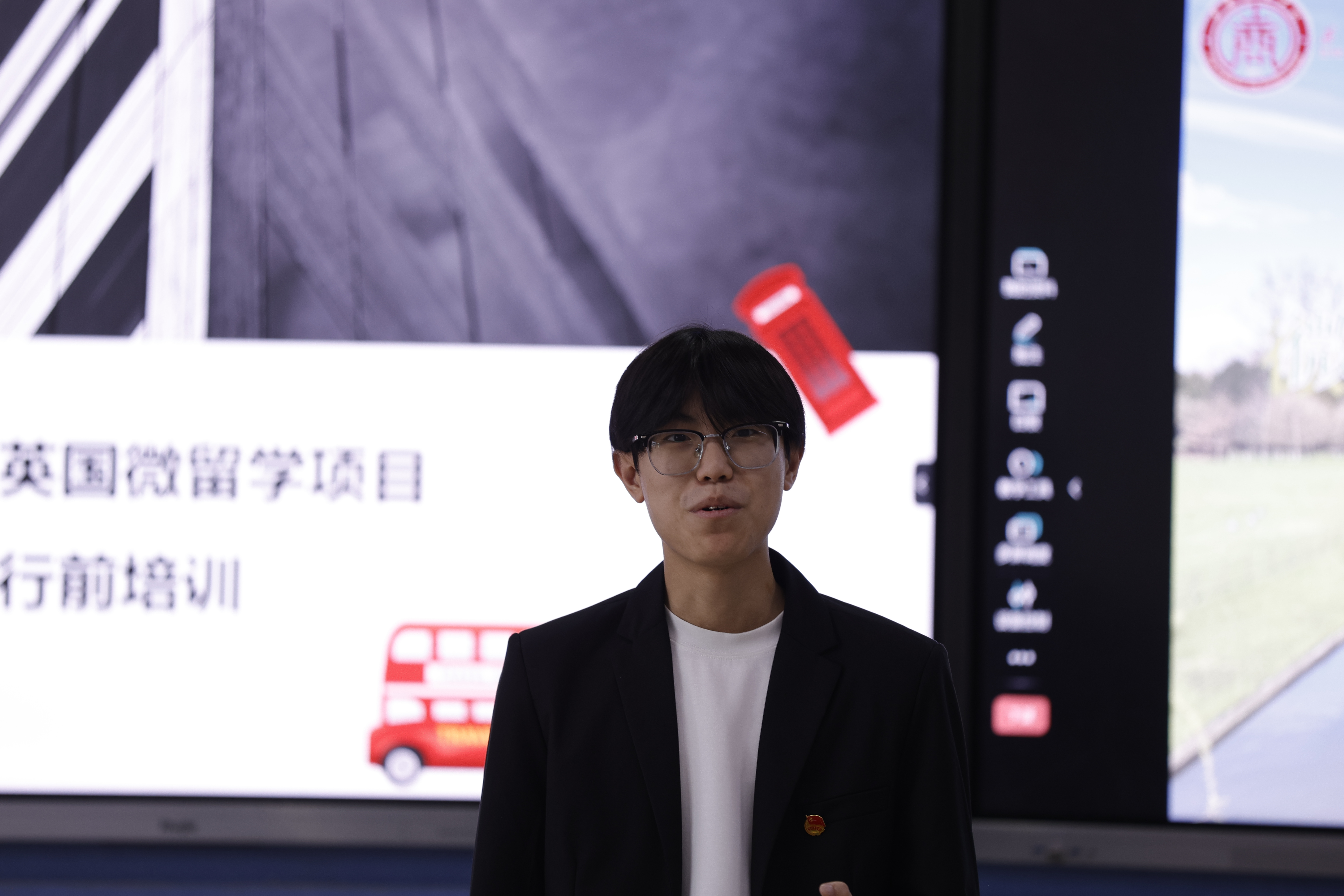 特别邀请了本次出团的学生代表冯楷清分享心得。他结合自身准备过程中的思考,从行李整理的实用清单,到对海外课堂的期待与规划,毫无保留地将自己的经验传递给同伴。他的分享充满真诚与共鸣,让在场学子们感受到“同伴同行”的温暖力量,也让大家对即将到来的微留学之旅多了一份期待与底气。