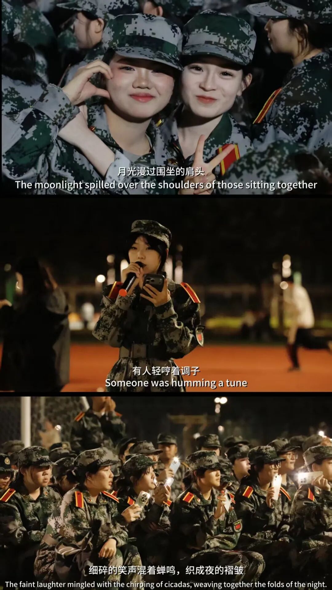 当夕阳为天空泼上橘红的颜料,训练的紧张感被晚风揉碎。少年们围坐成圈,音符在暮色里跳荡,有人跟着轻哼,跑调的歌声混着笑声,惊起栖在树梢的蝉。“月光漫过围坐的肩头,细碎的笑声混着蝉鸣,织成夜的褶皱。”有人抱着手机当提词器,清唱一首歌谣,晚风便成了最温柔的和声,把心事都吹进了每个人的耳朵里。