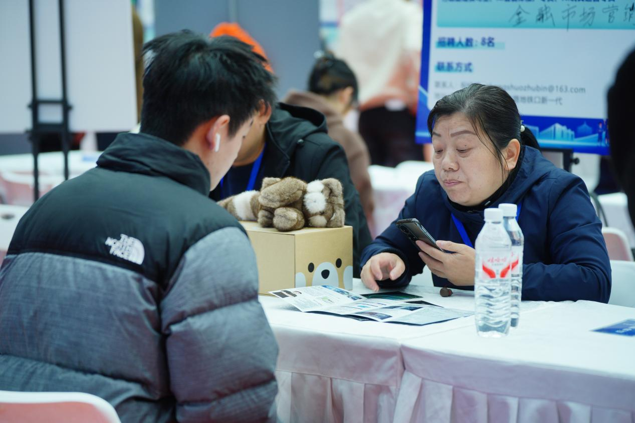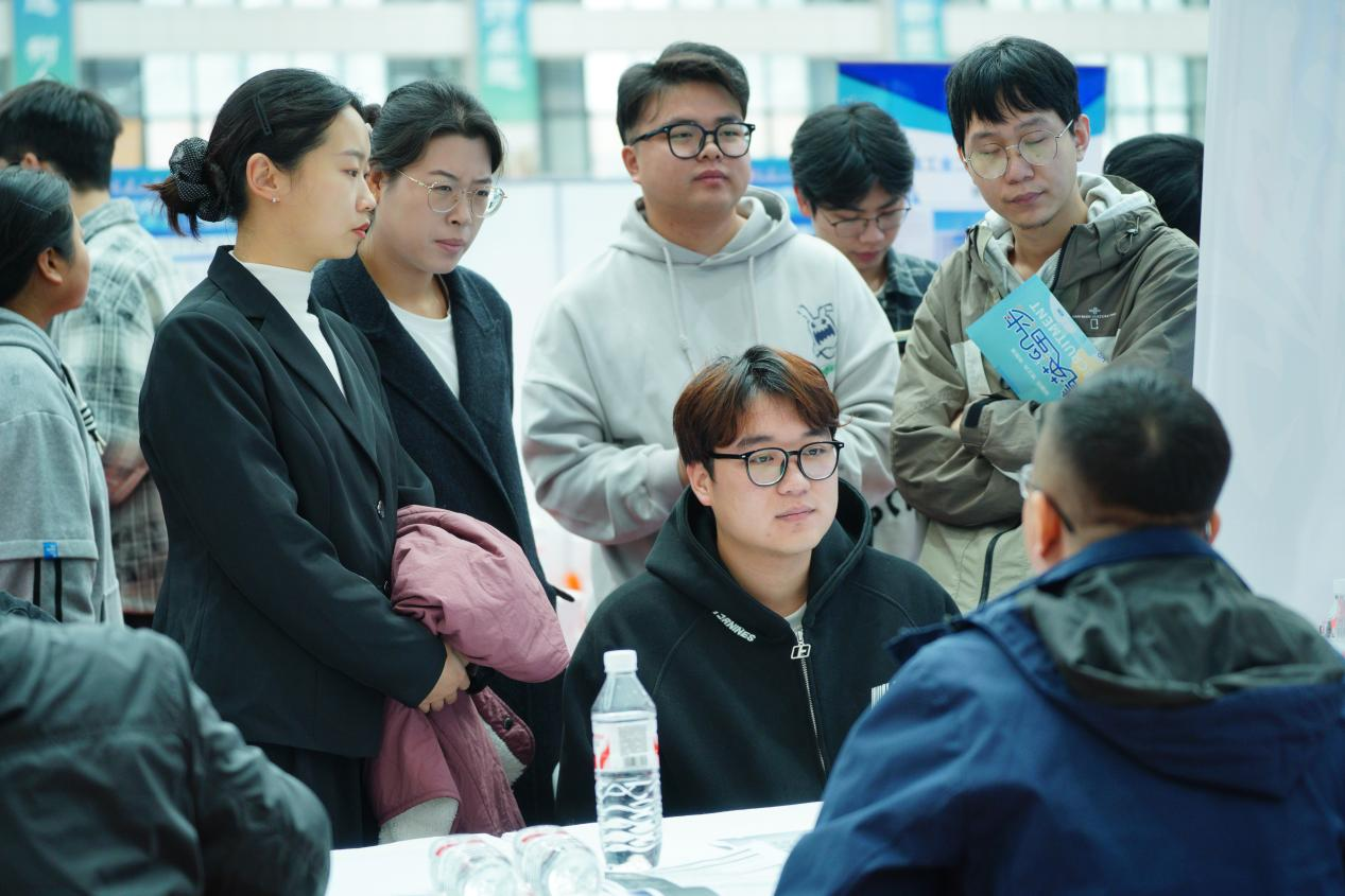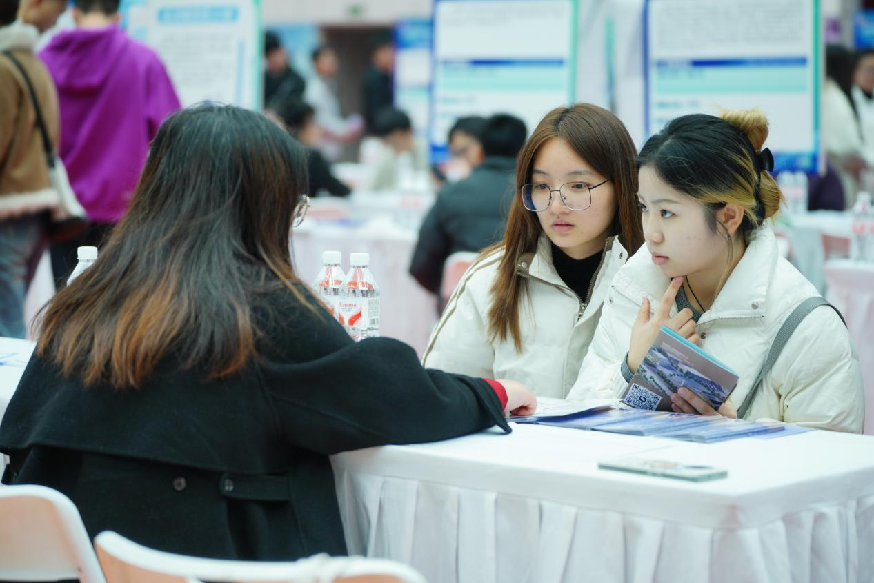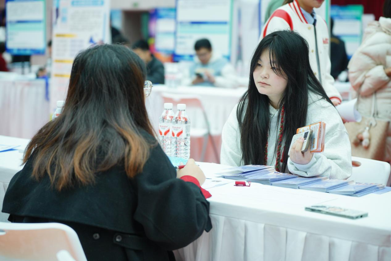 虽然阴雨绵绵,却抵挡不住同学们求职的热情。招聘会现场,同学们手持精心打磨的简历,积极与企业招聘人员交流,咨询岗位详情、薪资待遇、职业发展路径等信息;企业招聘人员也热情地为同学们解答疑问,介绍公司文化和业务范围,双方互动频繁,气氛融洽。