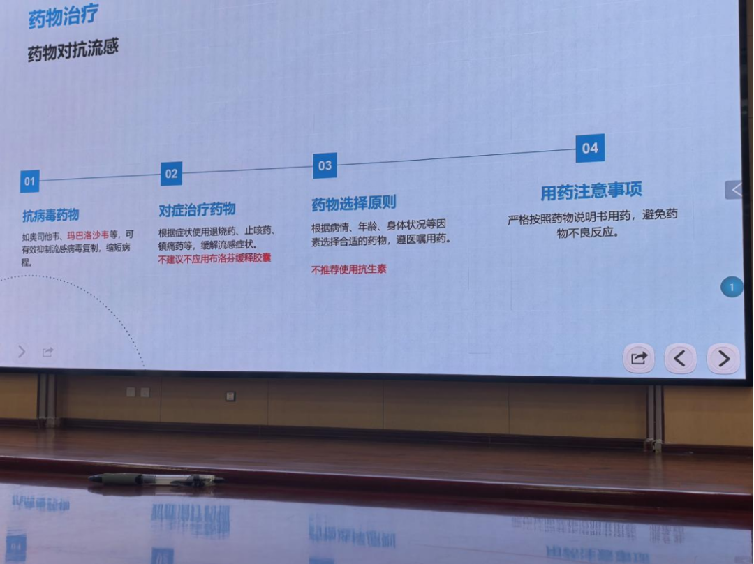 在讲座里,医生还专门拆解了流感的药物治疗逻辑:先是奥司他韦这类抗病毒药能直接抑制病毒、缩短病程;再是退烧药等对症药可缓解不适,但要避开布洛芬缓释胶囊;选药得结合病情、年龄等个体化考量,而且流感是病毒感染,不太推荐使用抗生素;最后一定要严格按说明书用药,避免不良反应。这些“避坑+实用”的用药要点,直接把流感治疗的关键讲透了!