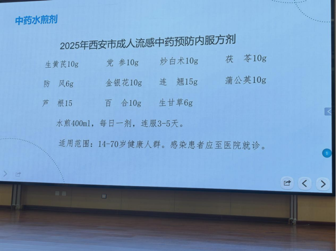 更贴心的是,现场还公开了2025西安市成人流感中药预防方:生黄芪、党参等11味药材配伍,水煎服用的方法和适用人群都讲得明明白白;连“黄芪汤代茶饮”这类日常养生方,也附上了体质适配建议。各药剂量明确,煎制方法为水煎取400ml,每日一剂、连服3-5天。其适用范围限定在14-70岁的健康人群,仅作预防用;若已感染流感,则需前往医院就诊,不可自行服用此方剂。该方案是针对流感流行期的预防性中药指导,体现了中医“未病先防”的理念。