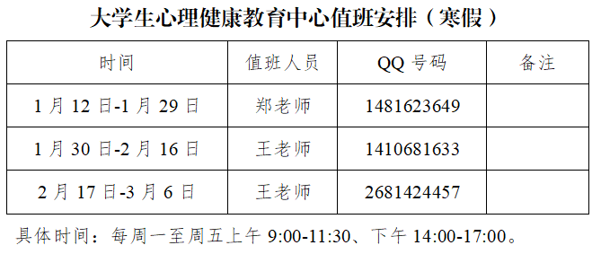 为帮助同学们在寒假期间更好地调节情绪与状态,从容应对假期中的学习、生活与情感小挑战,大学生心理健康教育中心将继续为全校学生提供线上心理援助服务,陪伴大家温暖度过岁末寒冬。具体安排如下: