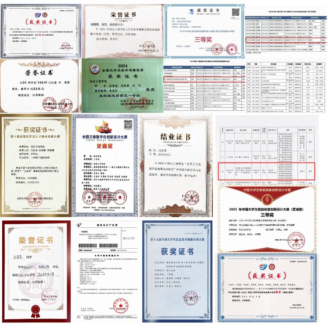 曾获国家奖学金、学业乙等奖学金、军训优秀学员;第七届中国高校智能机器人创意大赛北方联盟赛区省级三等奖、17 届全国三维数字化创新设计大赛 “数字工业赛项” 校级二等奖;省级三等奖及 “3D 打印赛项” 校级三等奖;中国国际大学生创新大赛校级铜奖; “艺体展未来” 文艺汇演优秀表演人员;全国大学生数学建模竞赛校级训练营 “优秀学员”、校级二等奖及省级一等奖;获第十届全国应用型人才综合技能大赛国家级三等奖;2025年获学业甲等奖学金、三好学生、中国国际大学生创新大赛校级银、铜奖;中国大学生智能装备创新设计大赛省级三等奖;第十五届全国大学生信息技术创新应用大赛省级一等奖;中华职业教育创新创业大赛省级二等奖;EduHacks2025 国际大学生创客马拉松大赛国家级三等奖。