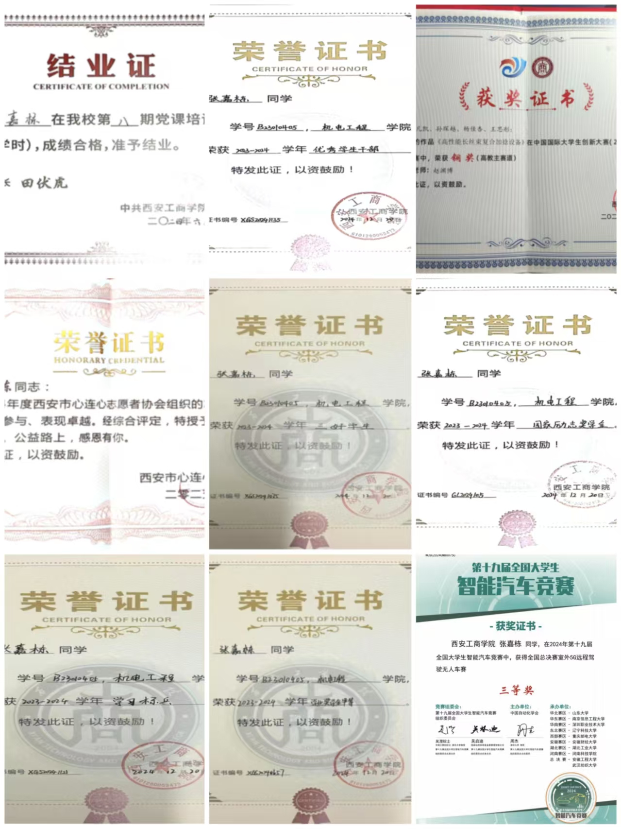 入学以来,他主动加入学院的科创工作坊,从文献查阅到实验论证,每一步都精益求精。为攻克技术难题,他常常泡在实验室到深夜,反复调试数据、优化方案,最终参与研发的项目获国家级奖项。在学科竞赛中,他和团队成员迎难而上,冷静应对现场突发情况,先后斩获第十九届全国大学生智能汽车竞赛全国总决赛室外5G远程驾驶无人车赛全国三等奖、中国大学生工程实践与创新能力大赛陕西赛区三等奖等多项荣誉。他说:“科研竞赛不是终点,而是提升自我的阶梯。”如今,张嘉栋同学仍保持着对科创的热忱,以实干笃行诠释青年担当,在追求卓越的道路上不断前行。