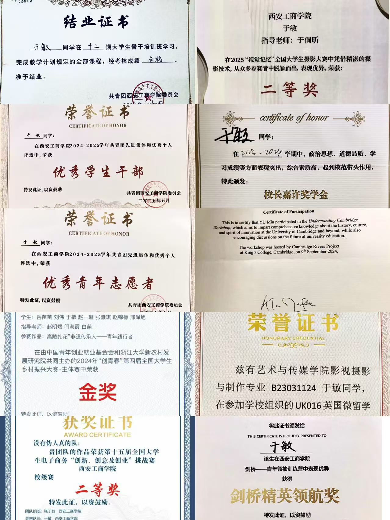 此外,她始终秉持着高度的责任感与使命感,以高涨的热情和积极主动的姿态,全力以赴投身于志愿服务工作,主动承担起一系列既繁杂又关键的志愿服务任务。于敏同学积极参与丰富多彩活动,在这些活动中,凭借自身的努力和出色表现,成功获得了剑桥大学参访证书、剑桥精英领航奖。长期以来,在个人发展进程中,始终坚定不移地秉持立足国际视野的理念。并非将目光局限于身边的小范围,而是积极将视野拓展至更为广阔、充满无限机遇的世界舞台。在此过程中,通过持续开展学习活动,全身心投入实践项目,并积极参与各类交流活动,以持续、有效地提升个人的跨文化交流能力。
