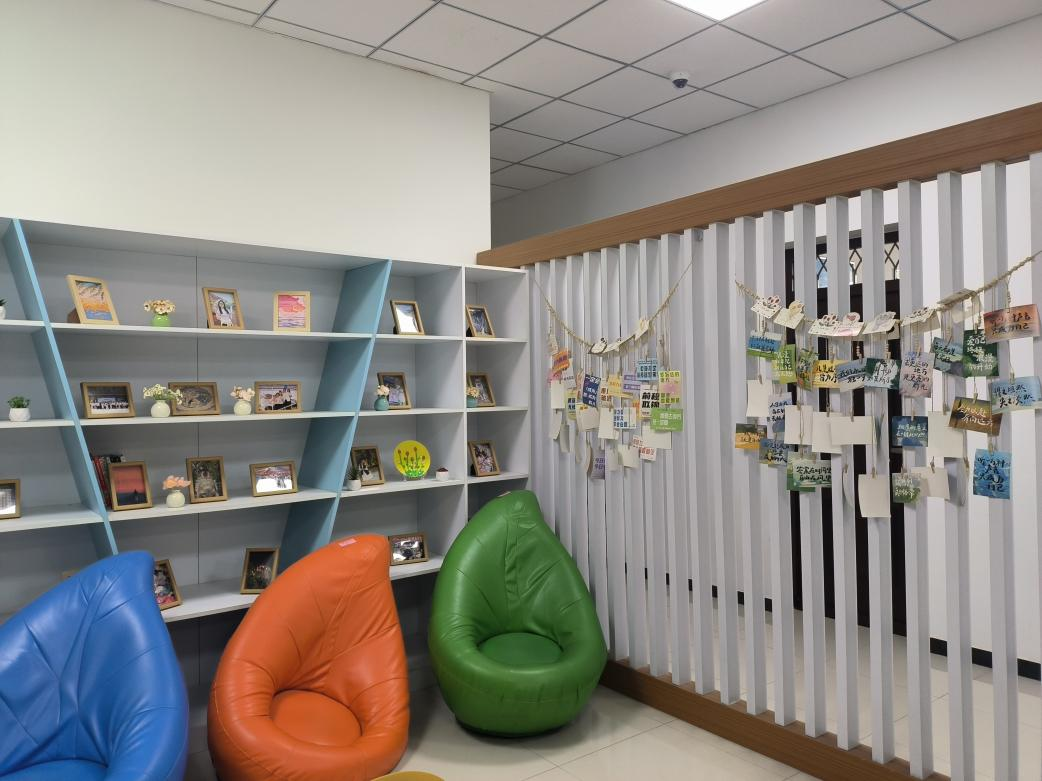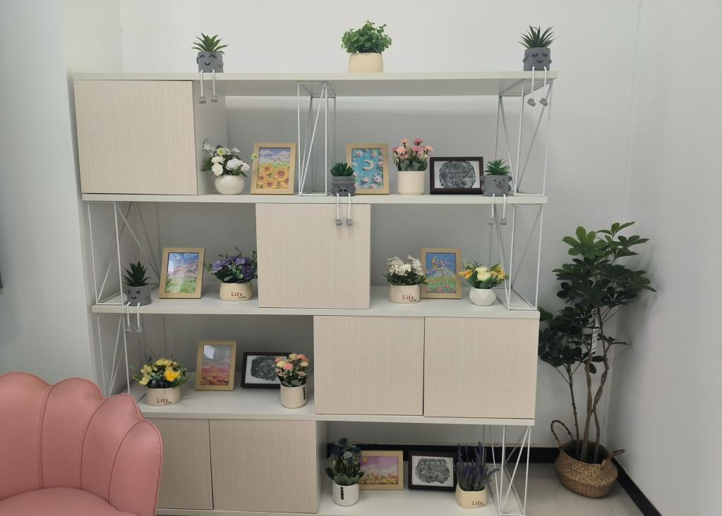 原本静谧的阅读区,如今增添了更多灵动气息。书架上摆放着一幅幅精致的黏土画,色彩柔和、造型生动,每一幅都蕴含着创作者的巧思与温度;角落错落有致地摆放着小巧玲珑的花瓶,或插干花,或养绿植,为这片书香天地注入了自然的生机与诗意。在这里,你可以捧一本心理读物,在艺术与自然的陪伴中,享受一段安然的自我疗愈时光。